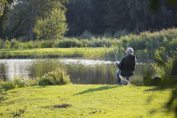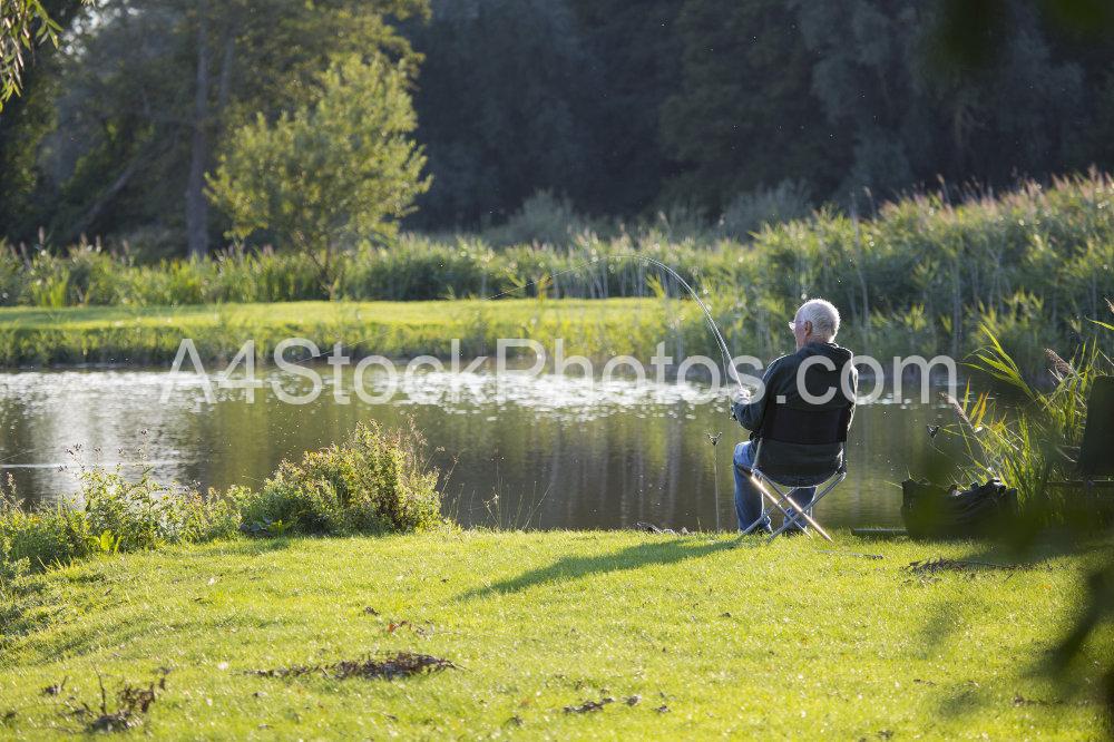 A coarse fisherman or angler playing a large fish while fishing a lake in Suffolk, England