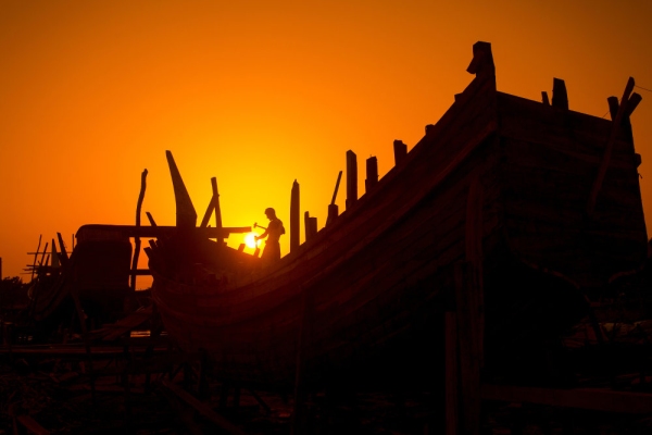 In the last light of Twilight, a craftsmen passing busy time in making on wooden boat at Noakhali, Bangladesh. According to the boat makers, the dry season, especially from December to June, is the ideal time for making the fishing boats. Craftsmen are hammering the nail in the wooden body of the ship and they are working till the end because the ships will have to float in the sea shortly after them.