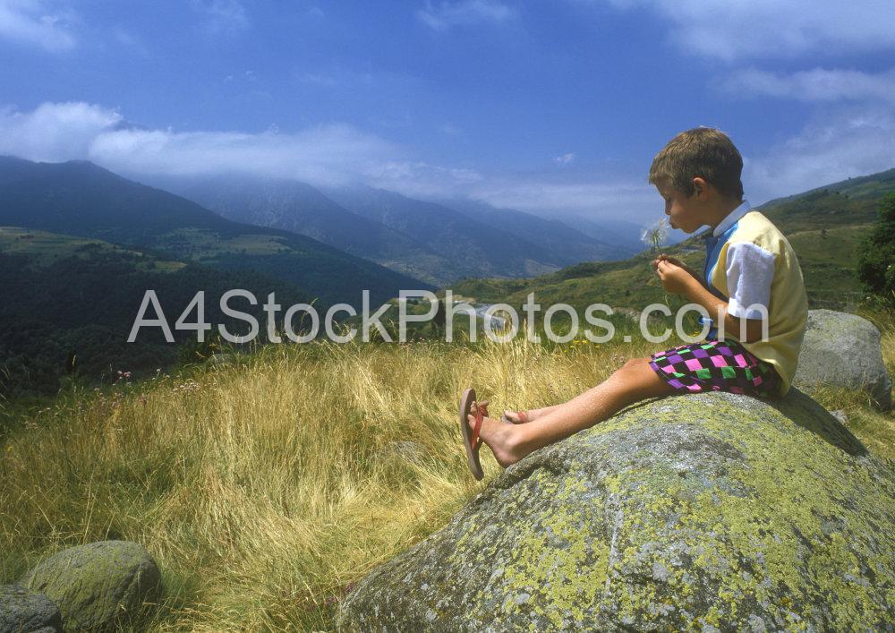 Young boy sitting on a rock overlooking the mountains in Andorra while blowing on a dandelion