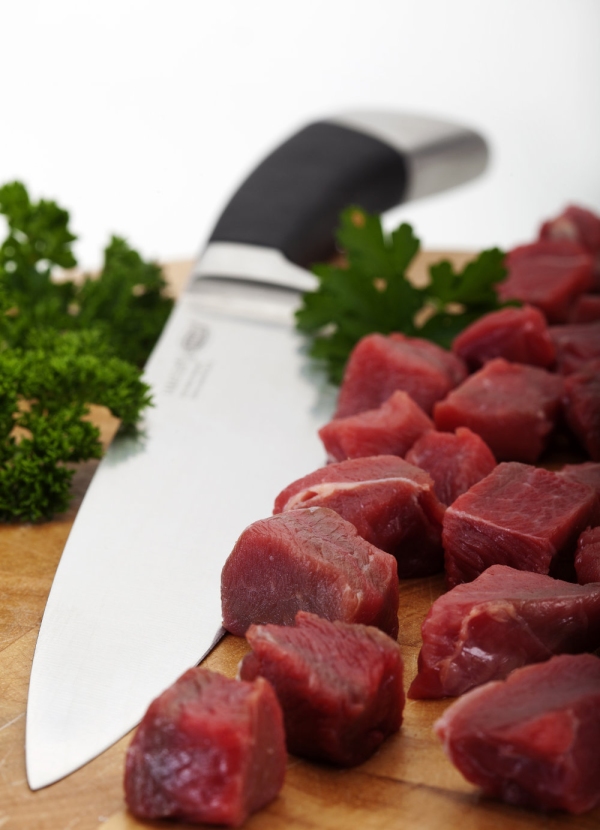 Chopped braising steak on a chopping board with carving knife. Out of focus background