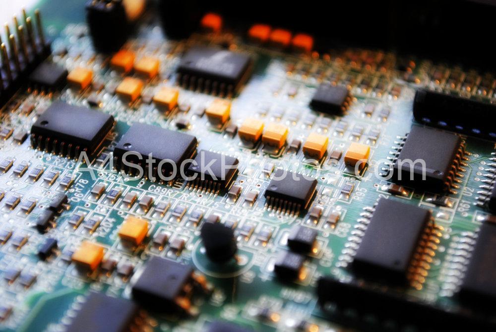 A computer electronic card with chips, microprocessors, transistors, explorers and other electronic parts.