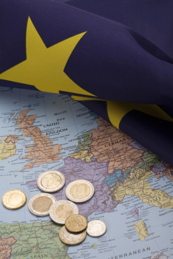 An atlas showing Western Europe, the Mediterranean European currency, with an EU flag in the background.