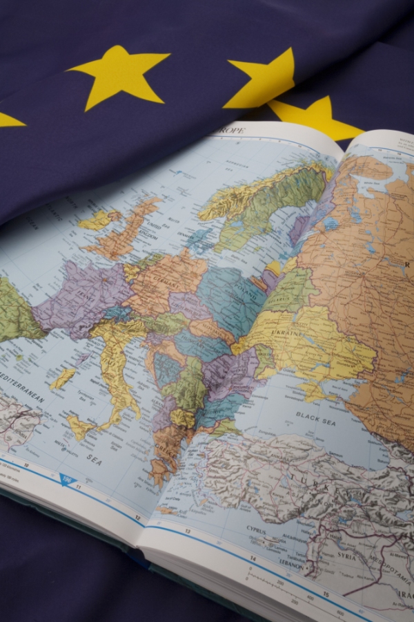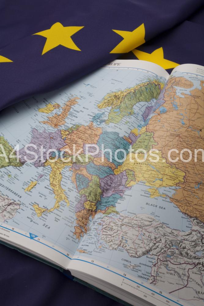An atlas showing the map of Europe and the Mediterranean with a European Union flag in the background