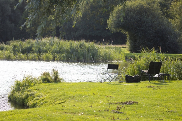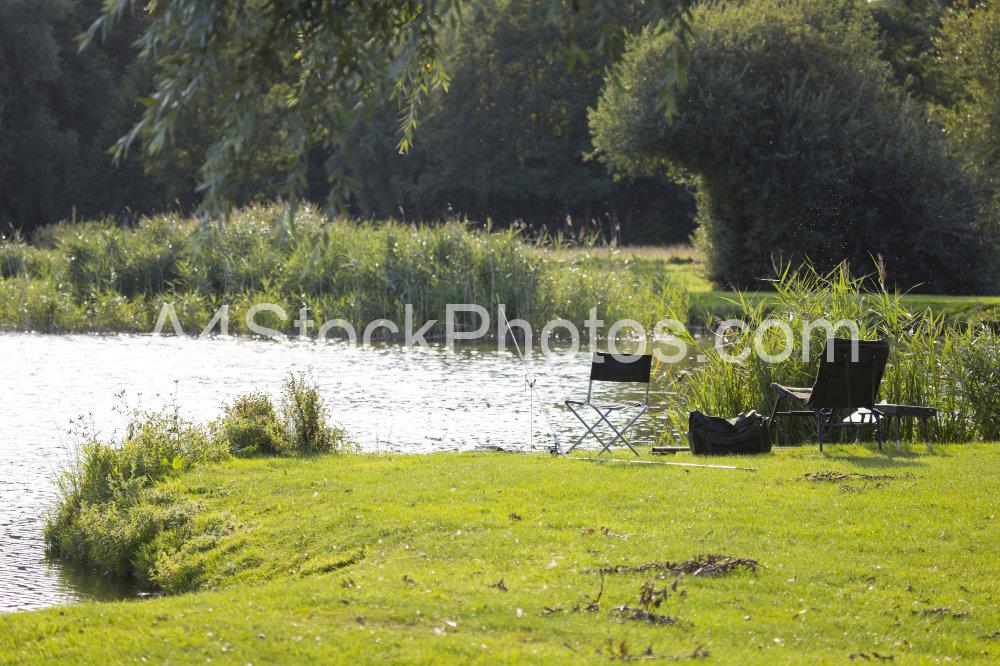 Coarse fishing gear ready on the banks of a beautiful lake in suffolk, England on a perfect summer evening