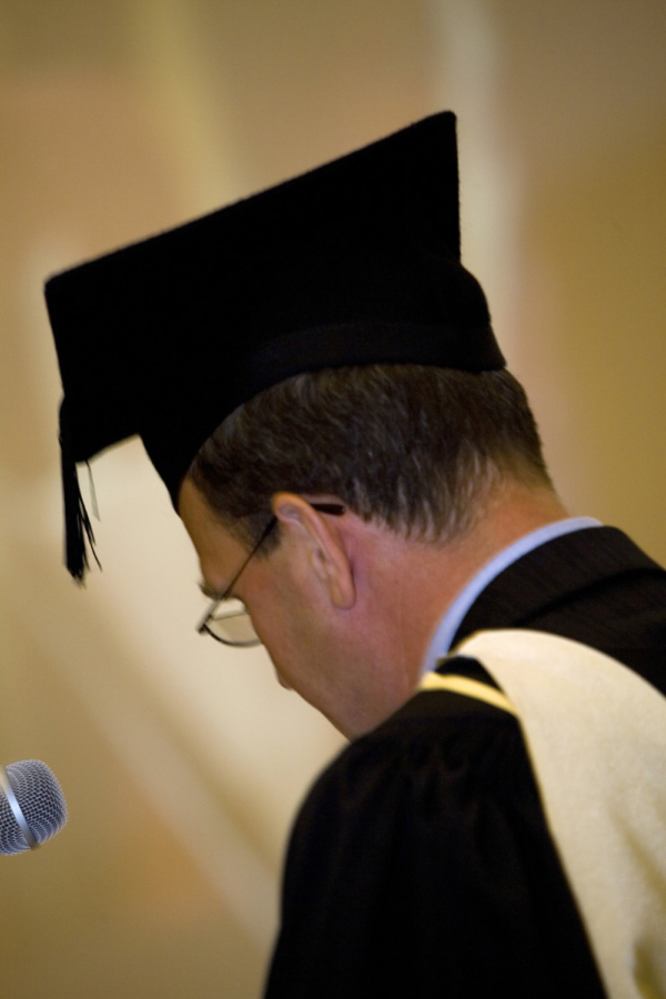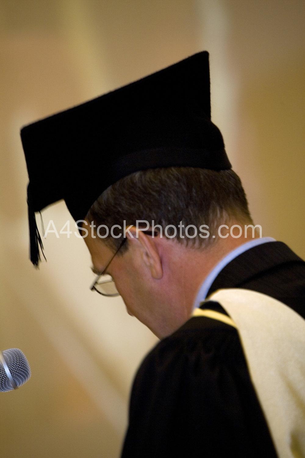 University official in full regalia on graduation day dispensing degree qualifications