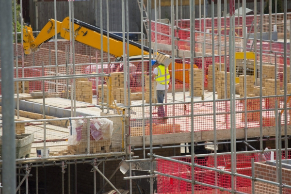 A building site worker or hod carrier or labourer carrying bricks on a building site with scaffolding