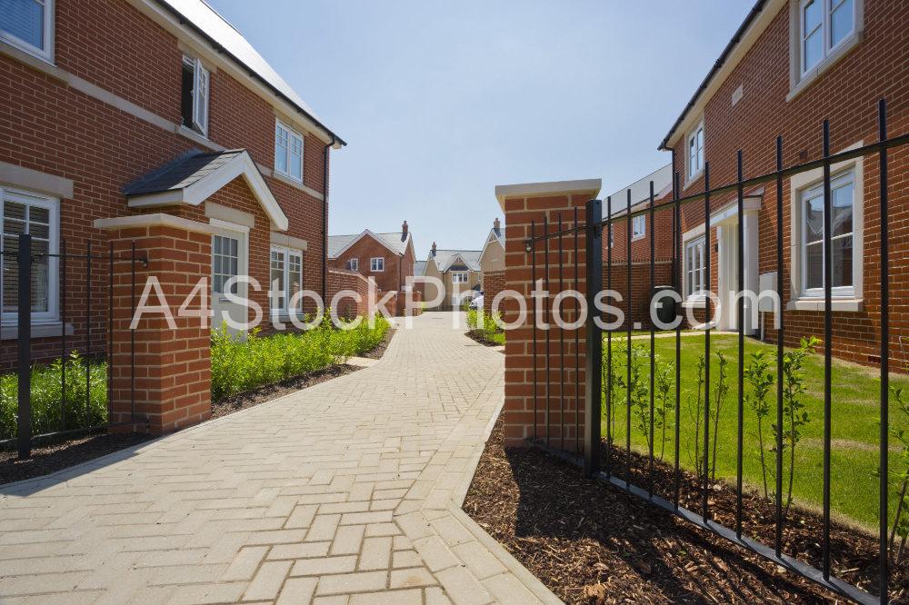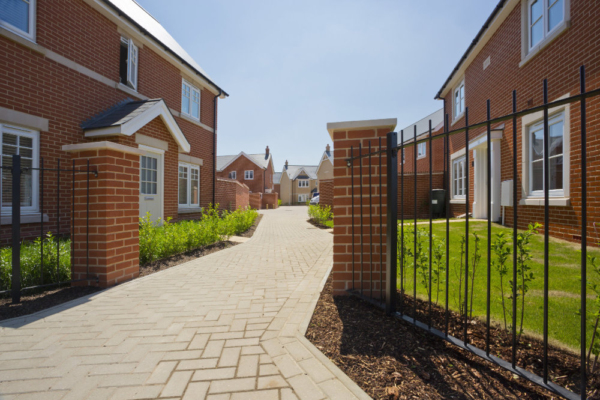 An empty street in a mostly complete new housing development, with houses sold before completion