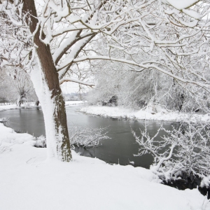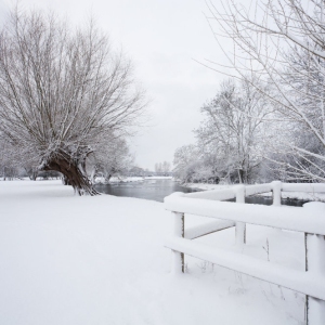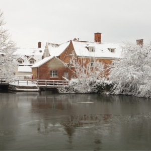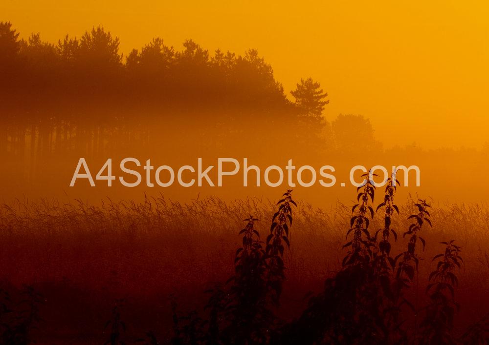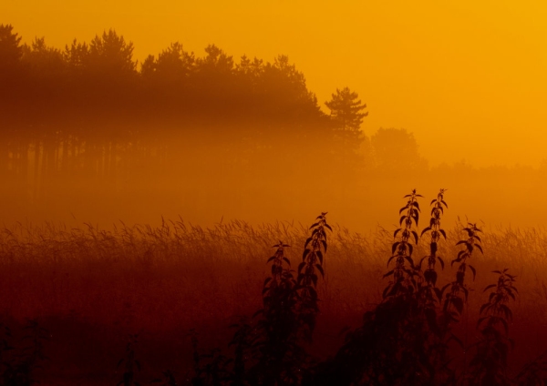 Orange tinted morning mist on low lying marshland and water meadows in Norfolk