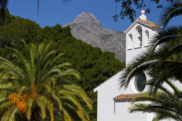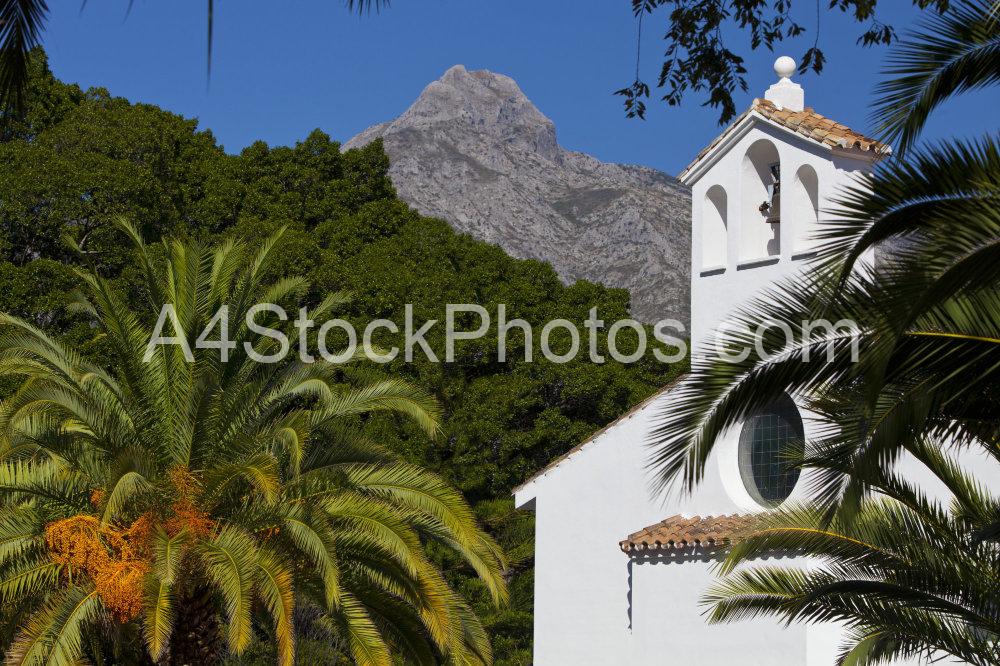 A spanish church in Andalusia with the Sierra de las Nieves in the distant background
