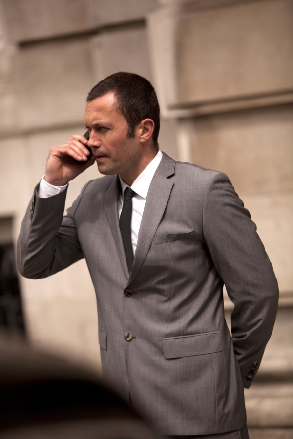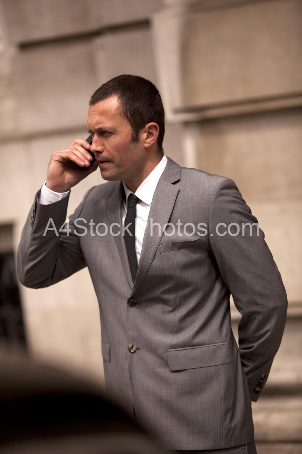 A tense moment as a close protection security officer talks to colleagues on the radio while waiting for important clients to emerge from a building