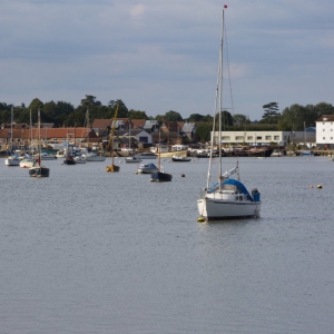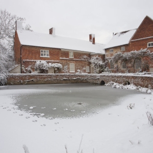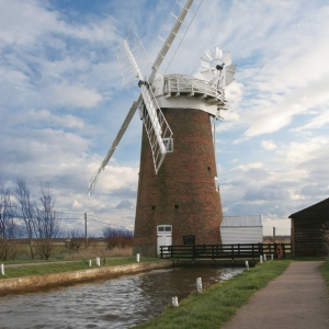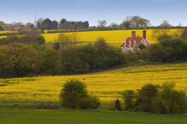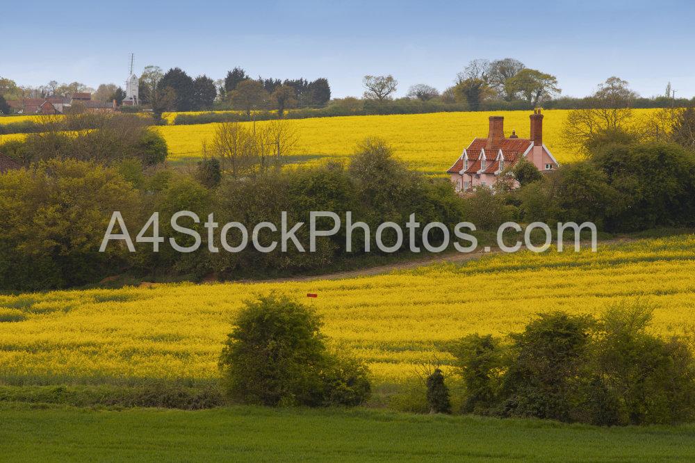 A traditional suffolk cottage with village in the background and rapeseed oil crops in the foreground