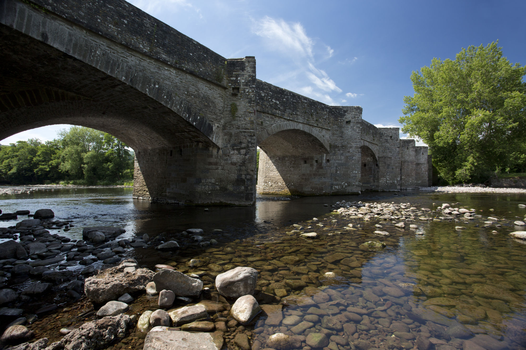 A close up view of the ancient bridge over the River Usk at Crickhowell in South Wales