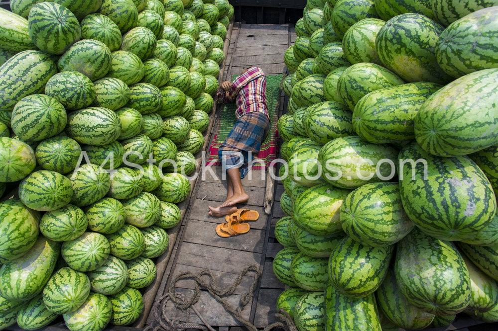 Labourers at a wholesale fruit market in unload fresh watermelons from boats in Buriganga River in waizghat area, Dhaka, Bangladesh
